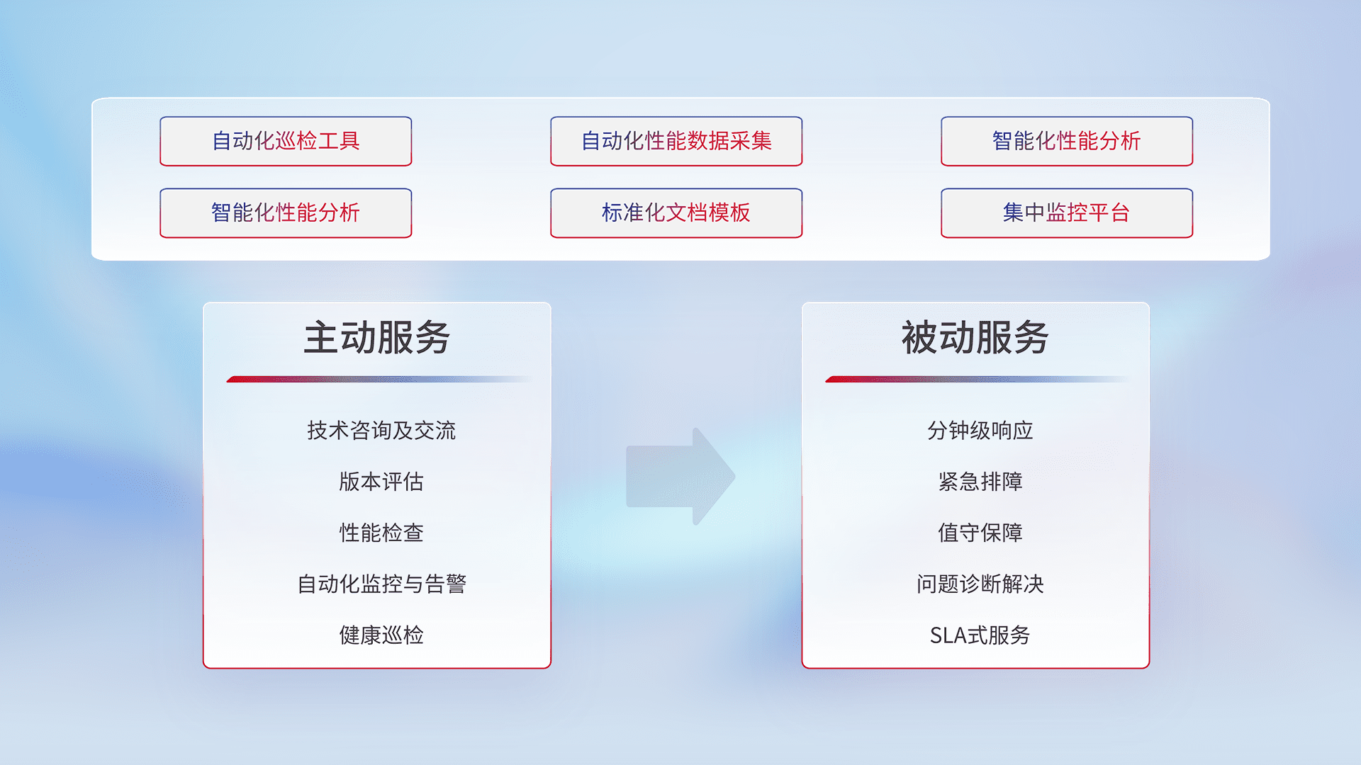 智能化工具和标准化文档,,保障服务质量,,提供主动服务(包含技术咨询、、、、版本评估、、、性能检查、、、、自动化监控与告警、、、、健康巡检)和被动服务包含(分钟级响应、、紧急排障、、值守保障、、、问题诊断解决、、SLA服务)。。